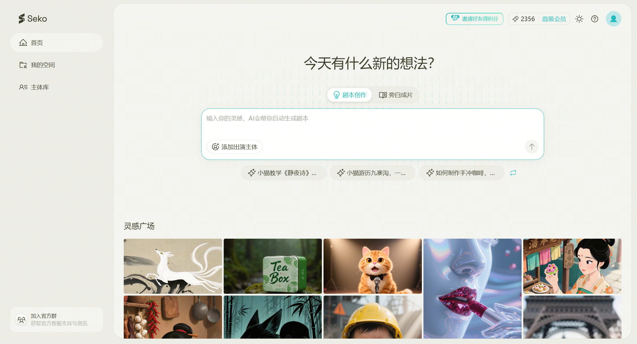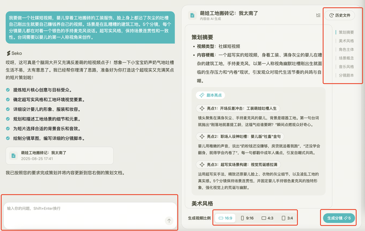 模式一:支持用户输入创意灵感,Seko自动生成接下来的视频策划案;