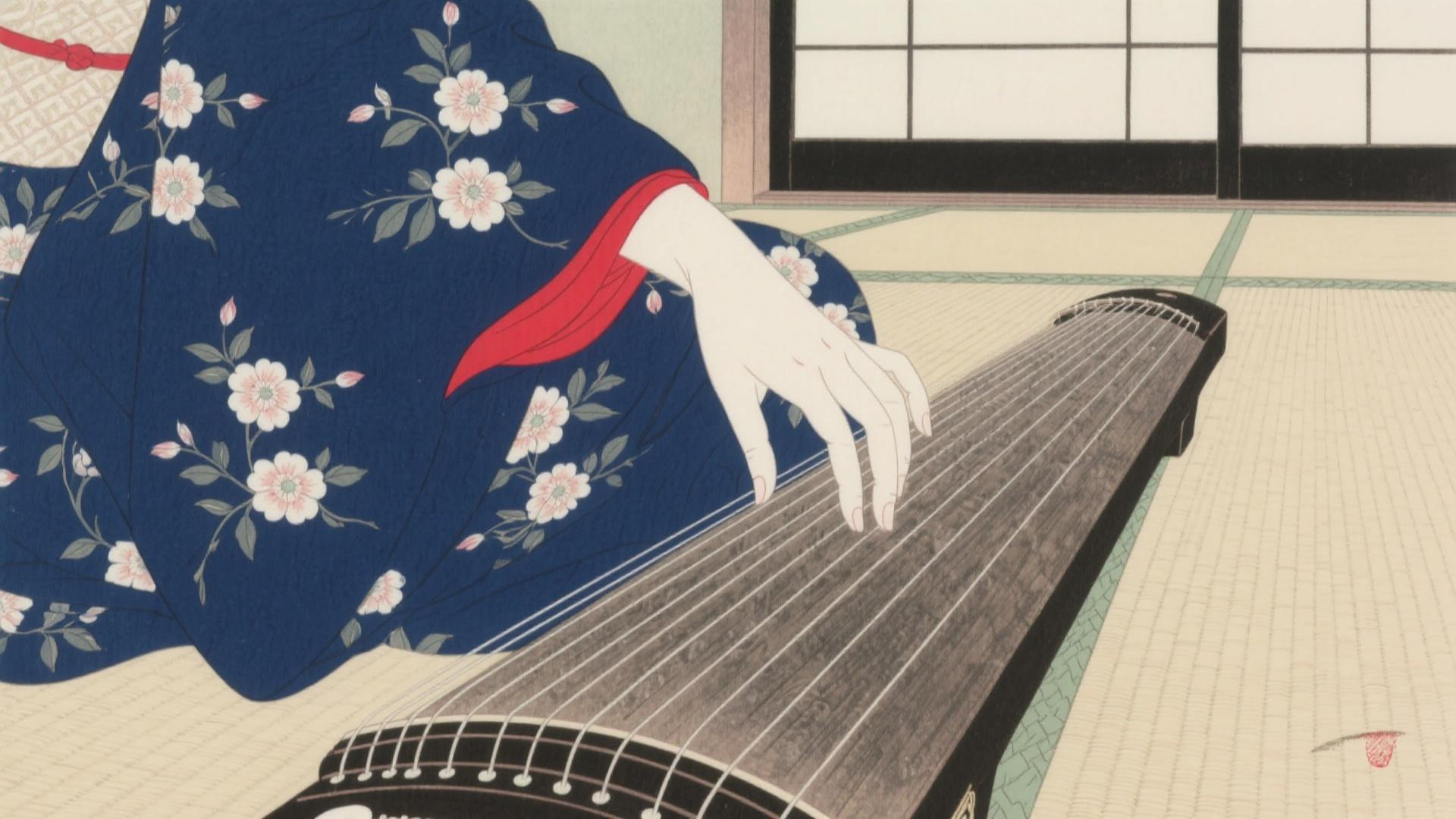 画风:浮世绘风格,以深邃的靛蓝、柔和的米白和少许朱红为主色调。主体:手部特写,侧面拍摄,浮世绘人类的手(戴有浮世绘花卉图案的深蓝色和朱红色丝绸和服袖口,手指修长)取代猫爪,轻拨琴弦。背景:空旷的传统日式和室内部,榻榻米地板纹理细腻,画面中央放置一把精致的古筝,琴弦在柔和的侧光下微微反光。