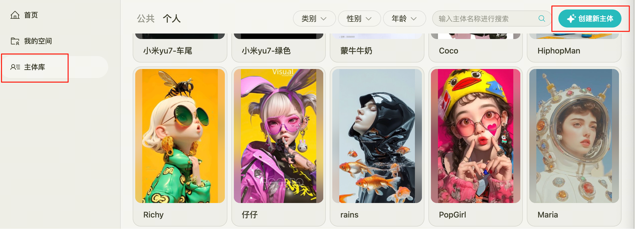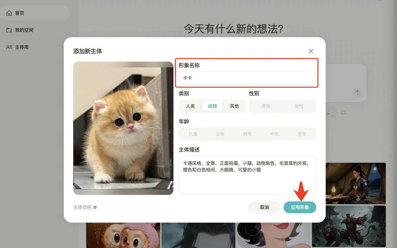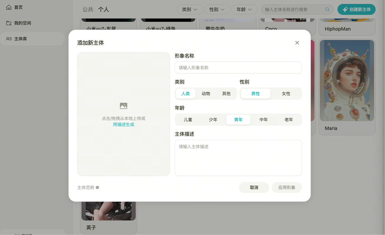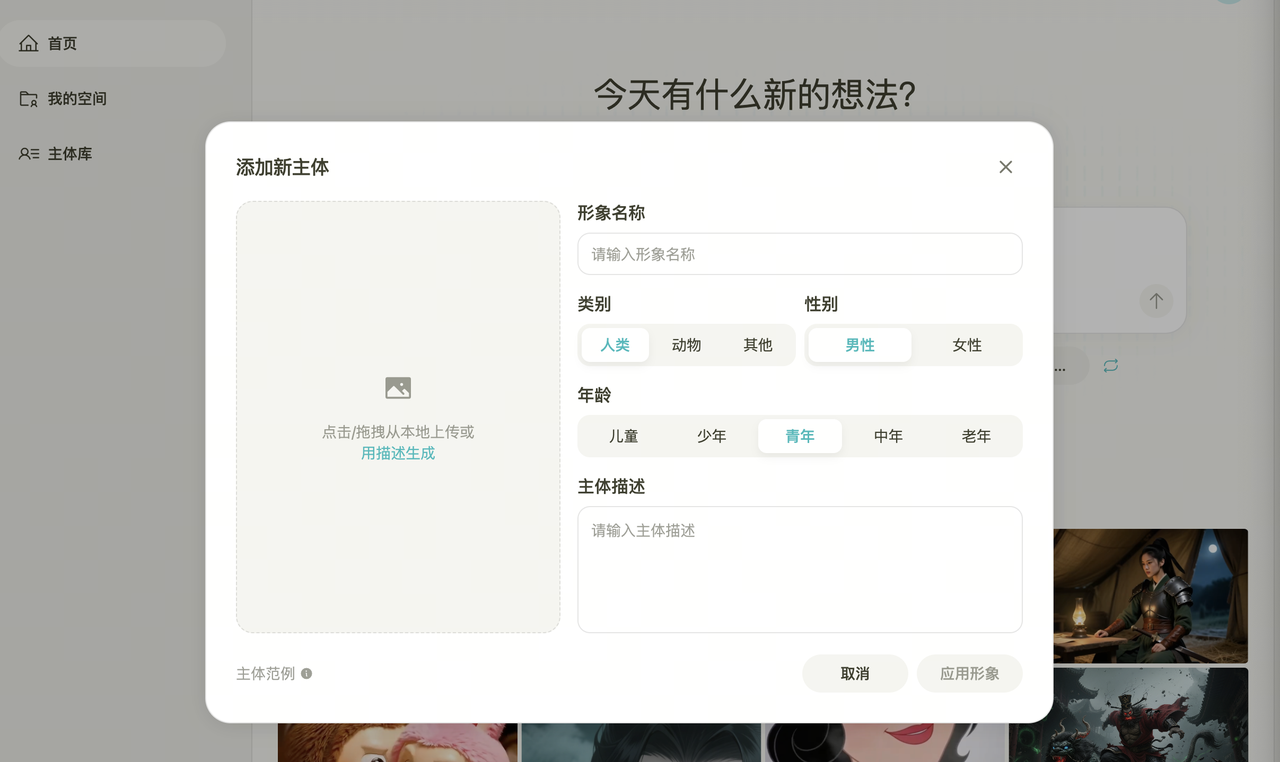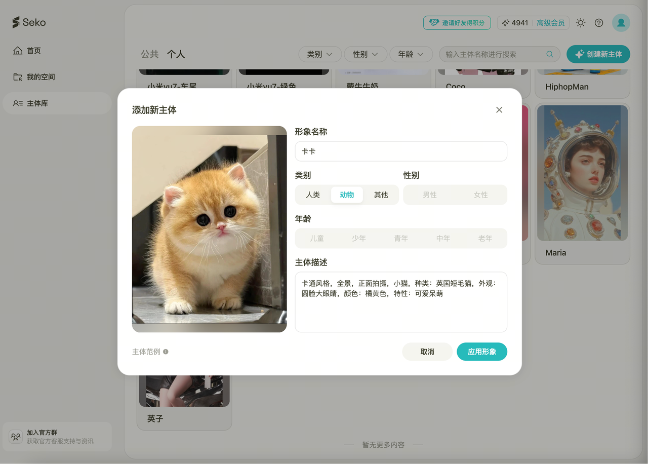 方法二:Seko首页主体库:【主体库】-【创建新主体】-【上传本地图片】或【用描述生成】- 设定好名称、类别、性别、年龄等,点击【应用形象】