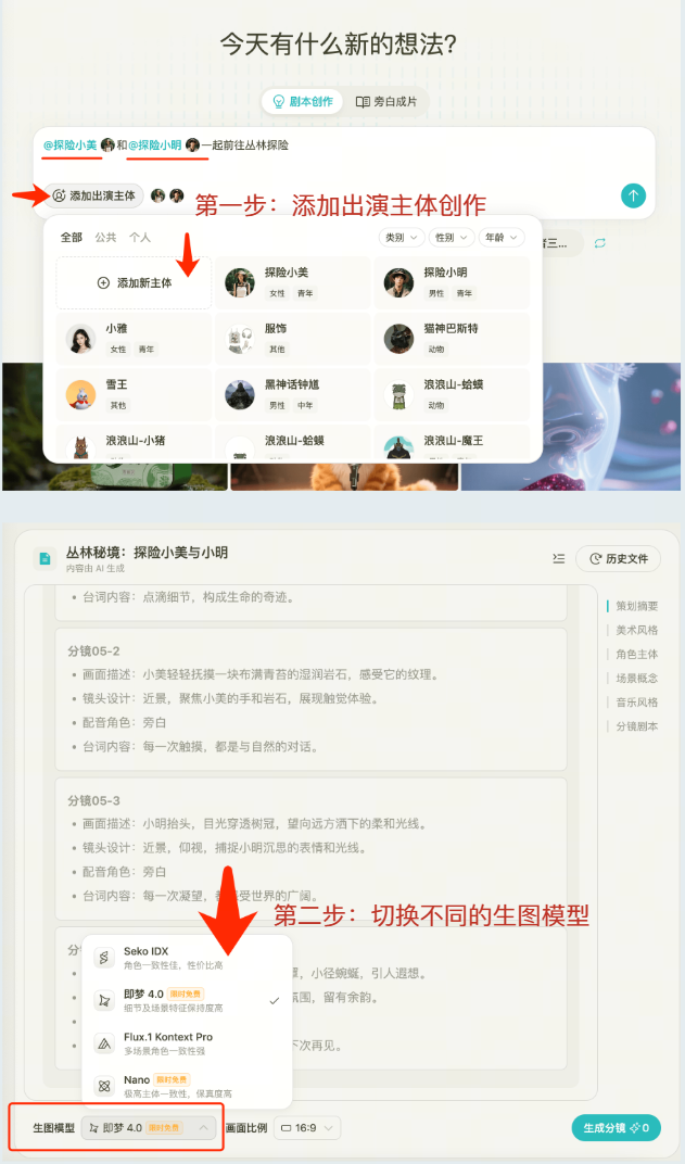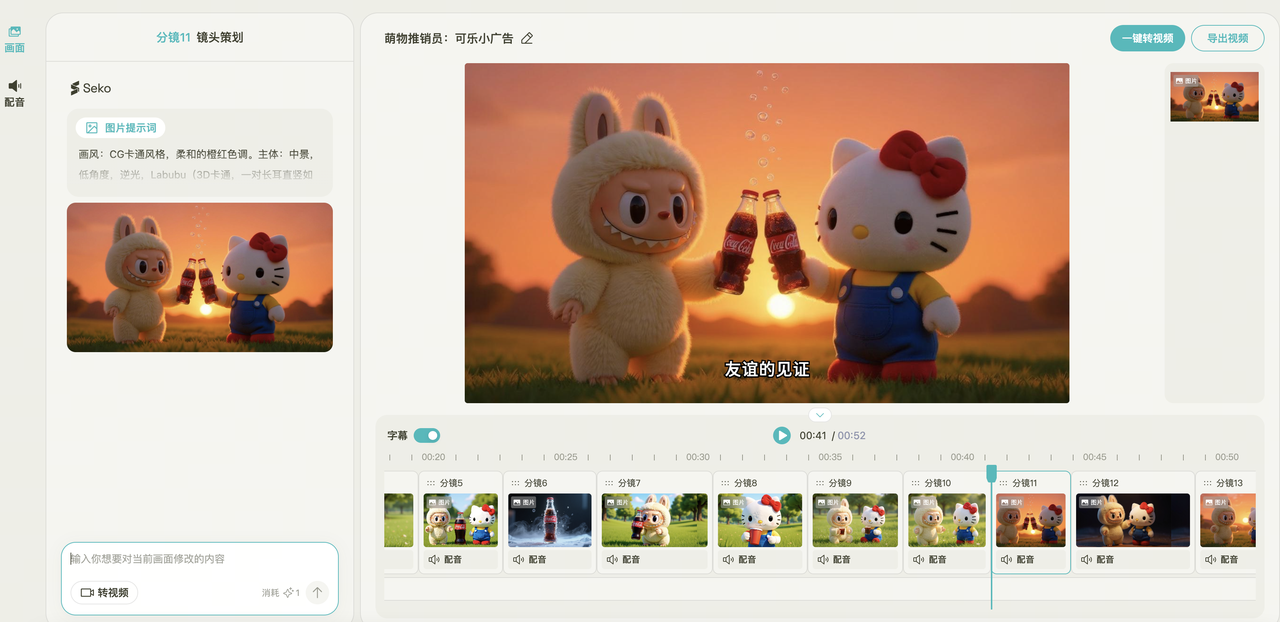 支持用户输入创意灵感+角色、物体参考图,Seko直接使用该参考图,生成接下来的视频策划案及分镜图;