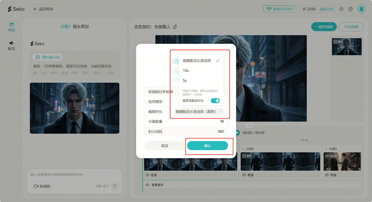 方法二:点击单个分镜对话框下【转视频】 – 对话框内显示当前视频提示词,可进行修改及首尾帧添加 – 点击模型选择视频模型及分辨率 – 选择视频时长 – 生成视频