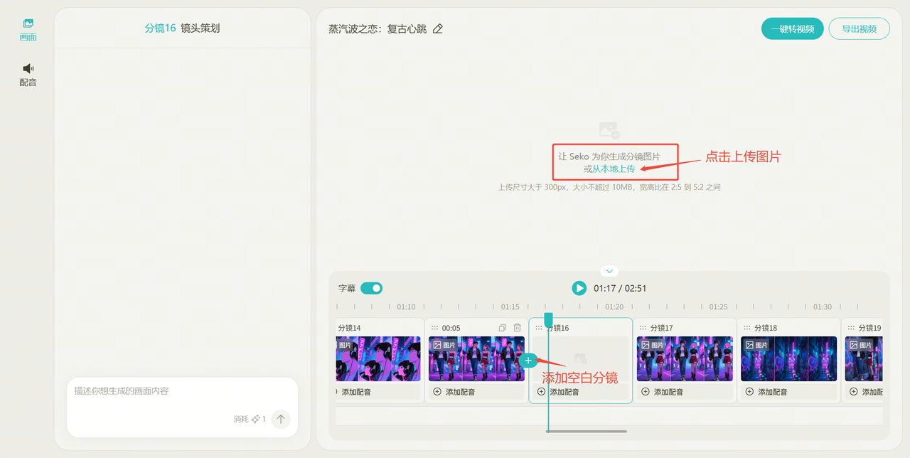 方法三:在分镜编辑界面,点击【+】号添加空白分镜 – 点击【本地上传】上传图片- 对话框内输入视频提示词及首尾帧添加 – 点击选择视频模型及分辨率 – 选择视频时长 – 生成视频