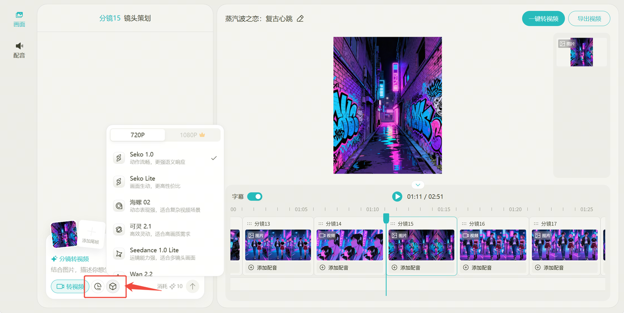 方法一:点击【一键转视频】- 选择视频模型及分辨率 – 选择视频时长- 点击【确认】