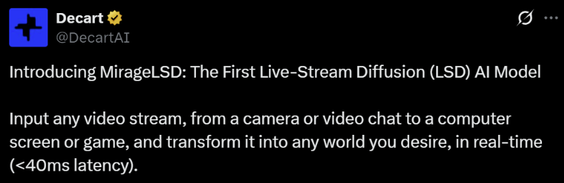 Decart发布了世界上首个实时的没有时长限制的,还支持任意视频流的扩散视频模型MirageLSD!